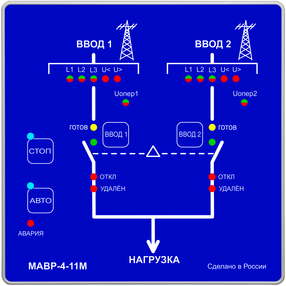 Модуль автоматического ввода резерва МАВР-4-11М (далее Устройство) предназначен для использования в схеме питания два вводаи и одна нагрузка. Устройствот управляет коммутационными механизмами для переключения нагрузок с основного источника питания на резервный (при возникновении аварии на основном вводе) и возврат к исходной схеме питания при нормализации рабочих параметров основного источника питания. Управление коммутационными механизмами осуществляется в ручном или автоматическом режиме. В качестве коммутационных механизмов могут применяться электромагнитные контакторы или автоматические выключатели (с моторприводом).