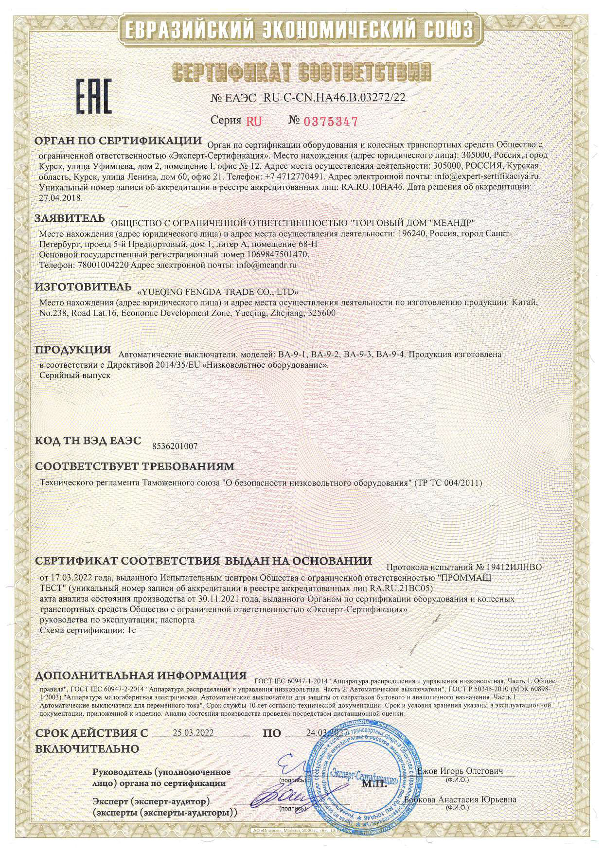 Автоматический выключатель ВА9-4 (далее Устройство) предназначен для защиты электрических цепей от перегрузок и токов короткого замыкания, а так же оперативного управления участками электрических цепей.